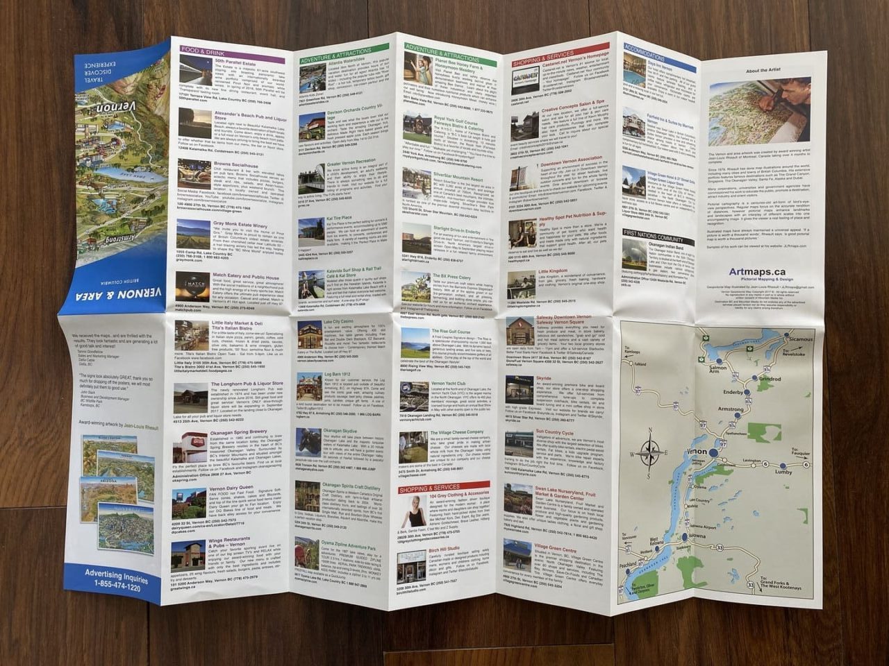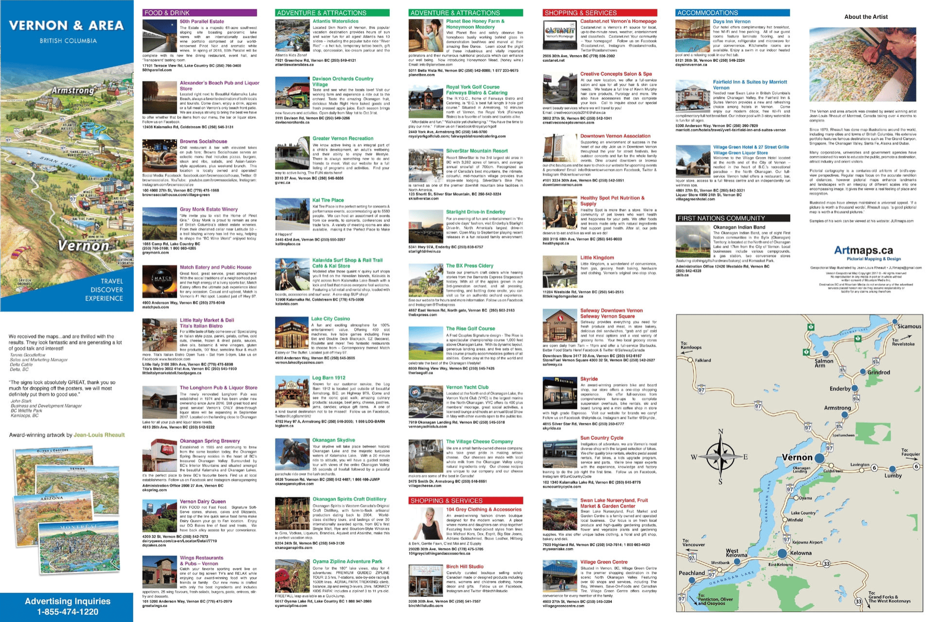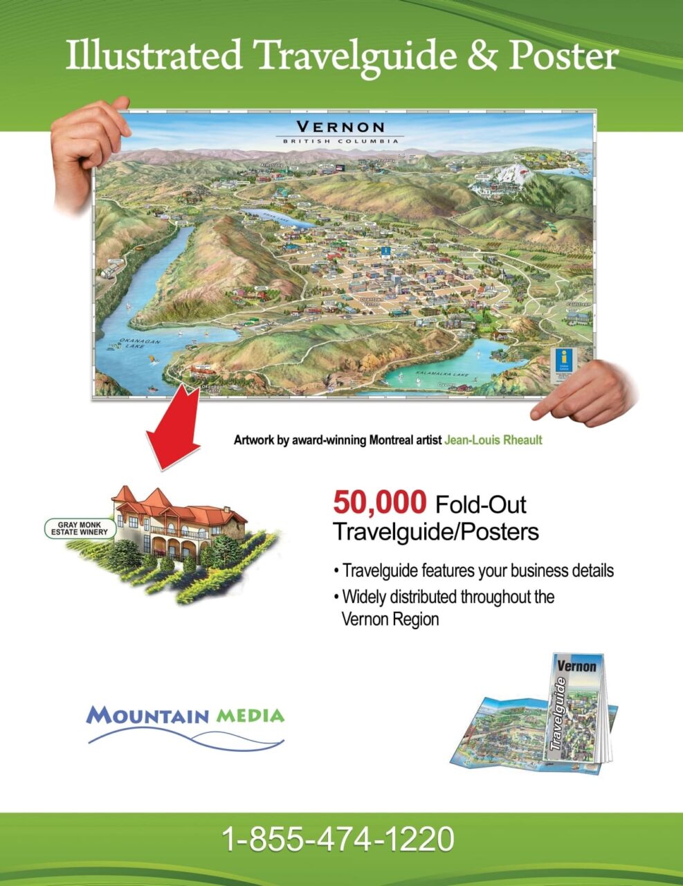 50,000 folded Travelguides printed and distributed throughout the region. Individualized photo and description of your business. Amazing award winning artwork of the area with illustrated buildings, geography and landmarks. These maps continually sought after by locals and visitors.